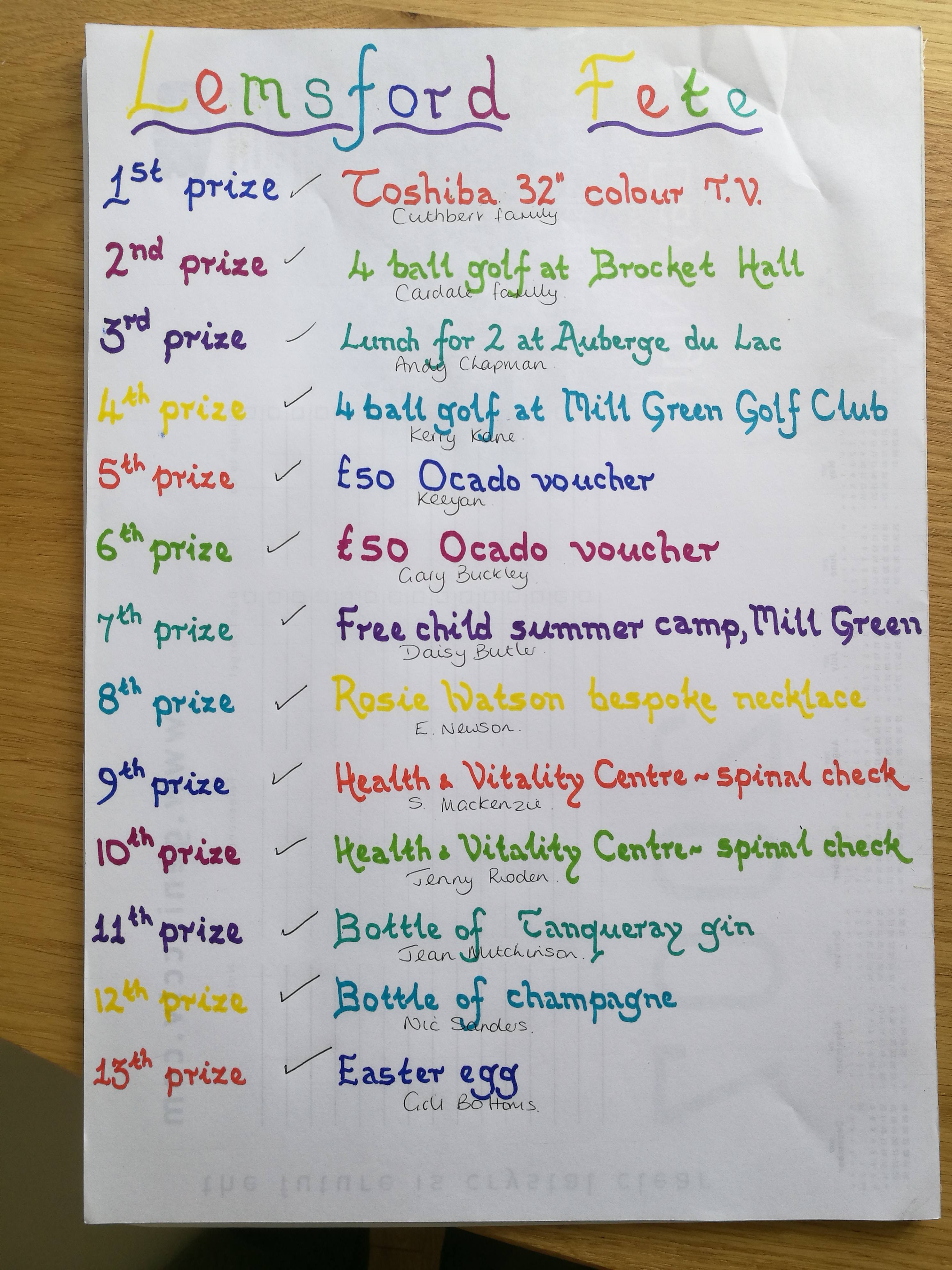 Grand Draw Results Although the Fete had been postponed this year due to the coronavirus, we still held the Grand Draw on Sunday 3rd May, at 4pm.The results were as follows: Thank you to all who took part. Back to the Homepage. Share this: Click to share on Facebook (Opens in new window) Facebook Click to share on WhatsApp (Opens in new window) WhatsApp Click to share on X (Opens in new window) X Click to email a link to a friend (Opens in new window) Email Click to print (Opens in new window) Print More Click to share on Pinterest (Opens in new window) Pinterest Click to share on LinkedIn (Opens in new window) LinkedIn Click to share on Pocket (Opens in new window) Pocket Click to share on Reddit (Opens in new window) Reddit Click to share on Tumblr (Opens in new window) Tumblr